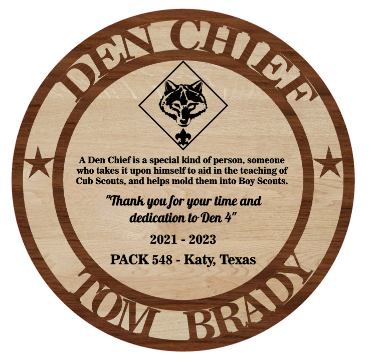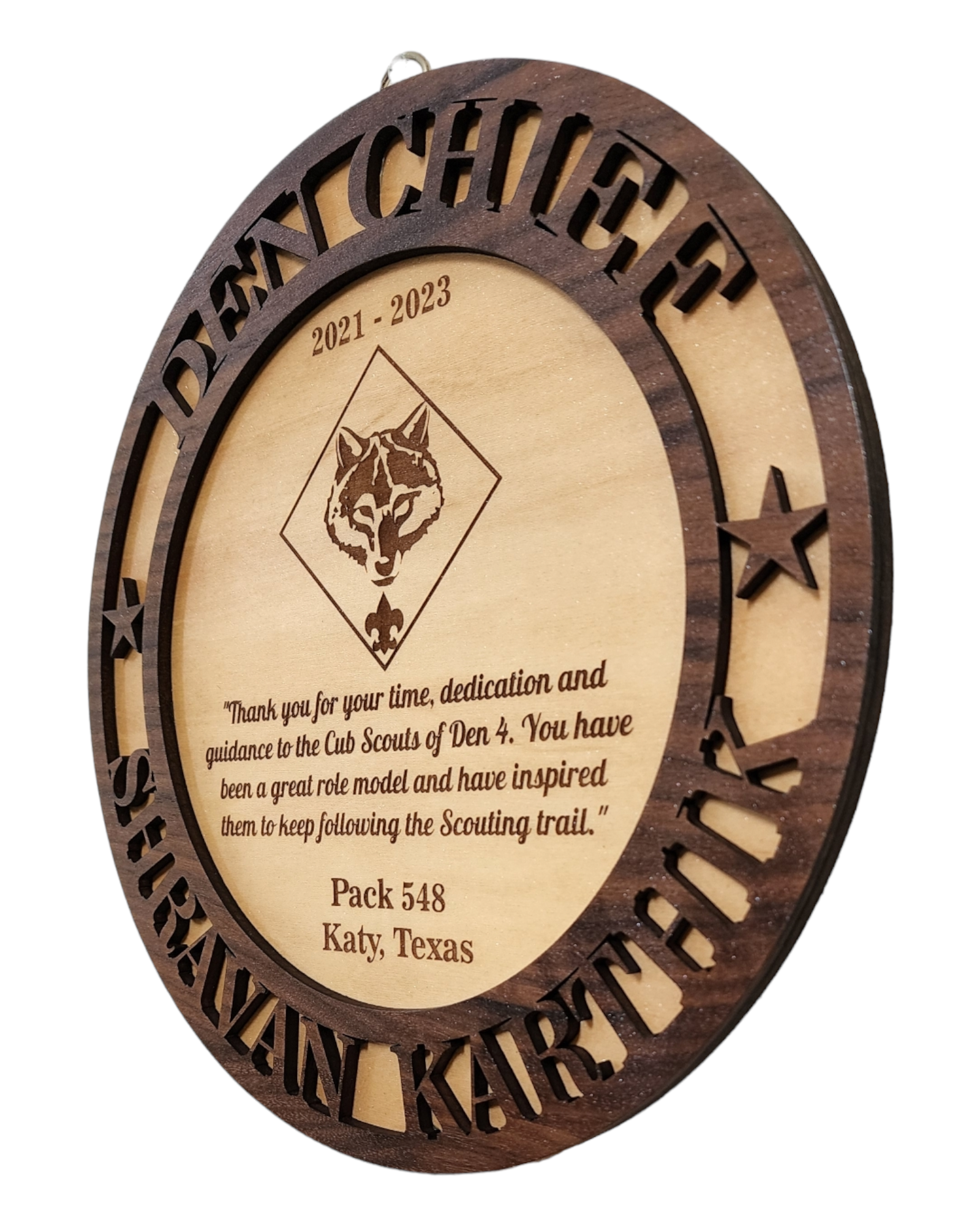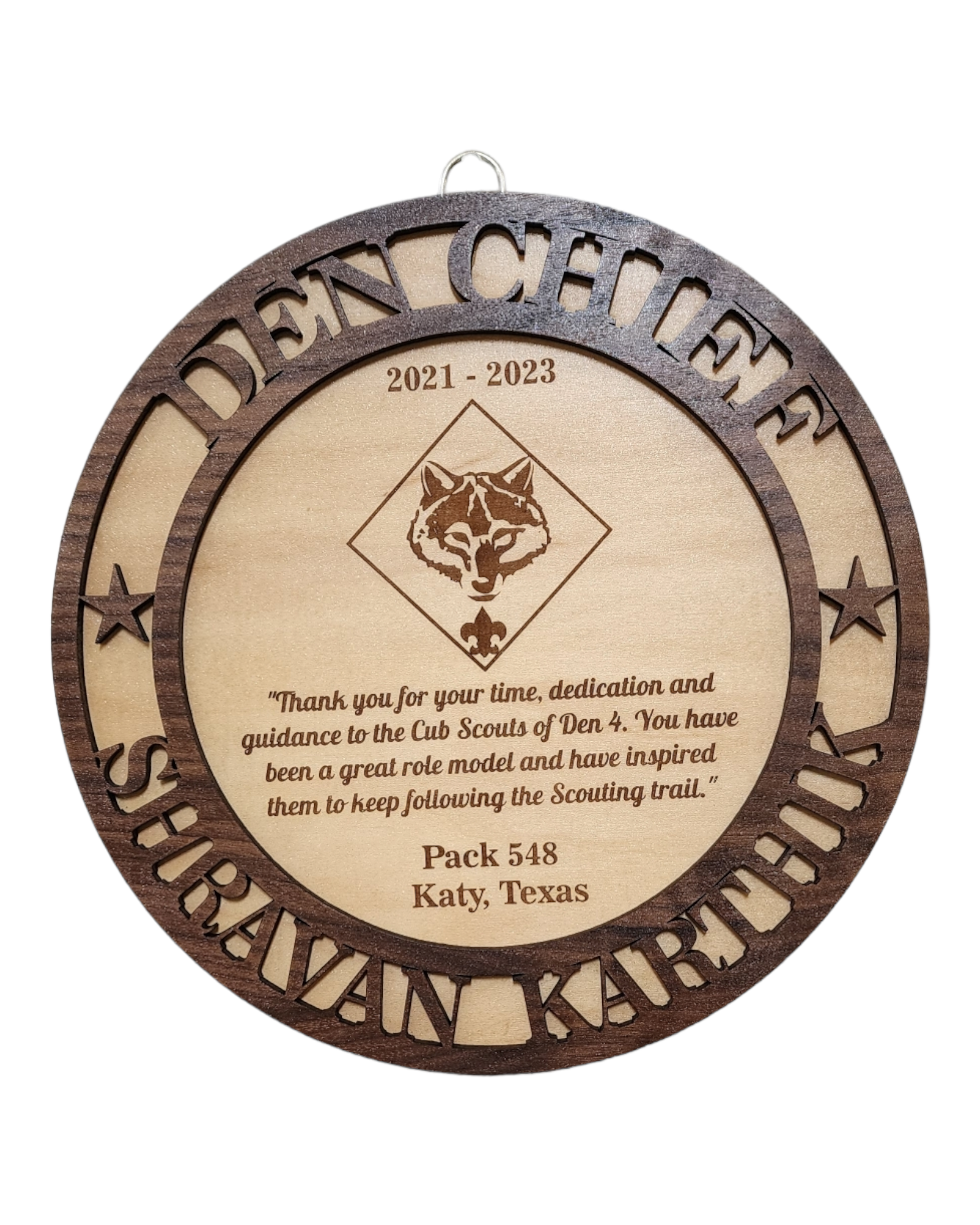 Commemorate the achievements of your dedicated Den Chief with our personalized wooden award. Measuring 11" x 11" and finished with expertly engraved design elements and a custom name, this circular plaque is the perfect way to recognize their hard work and leadership in the Boy Scouts of America.